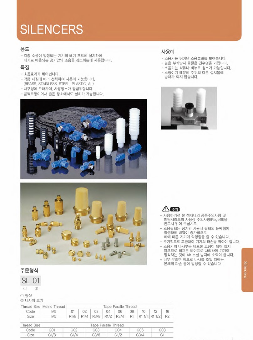 - 각종 소음이 발생되는 기기의 배기 포트에 설치하여 대기로 배출되는 공기압의 소음을 감소하는 데 사용합니다.